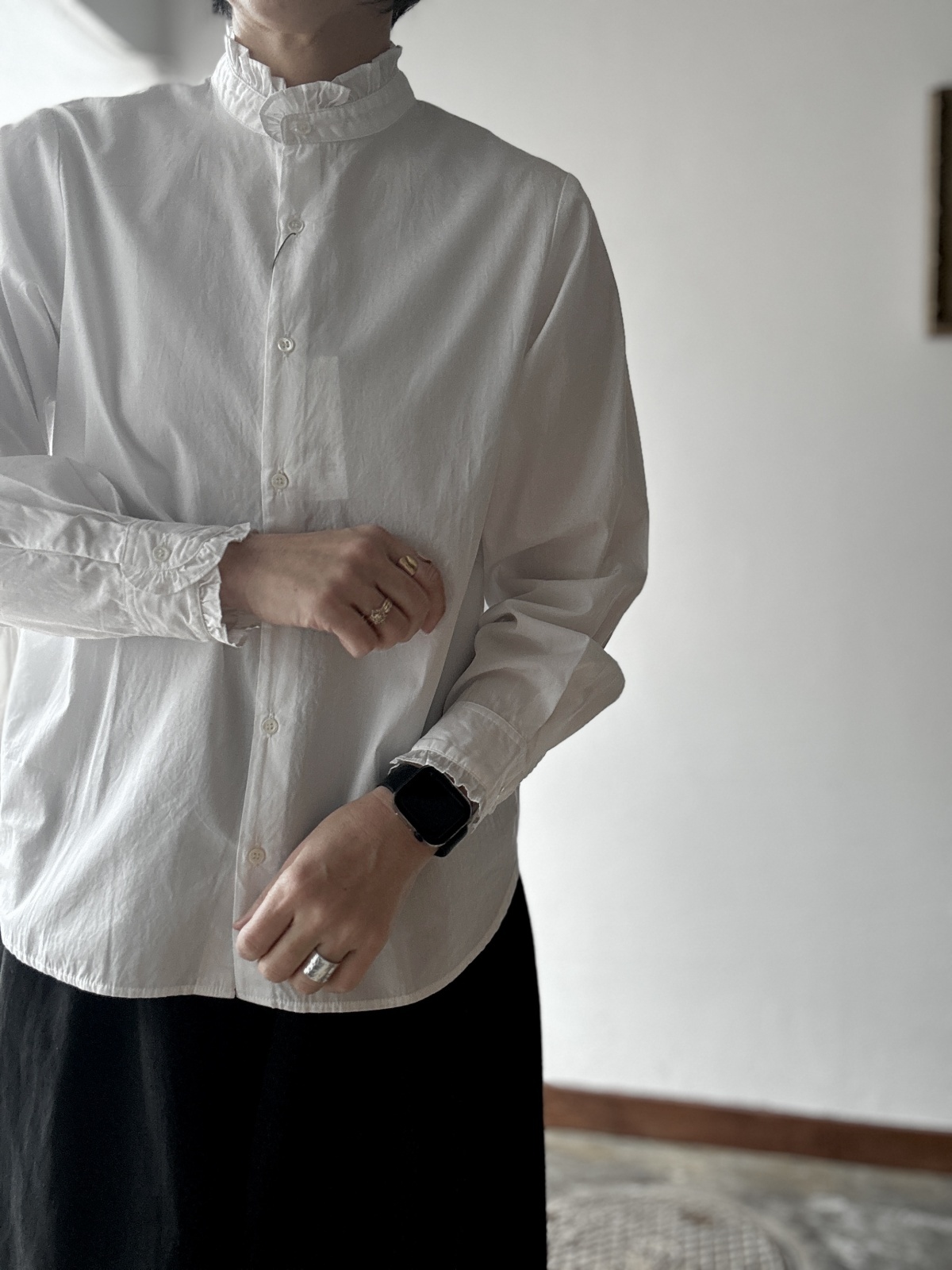 スタンドカラーのさりげないフリルのディテールがアクセントとなっています。
