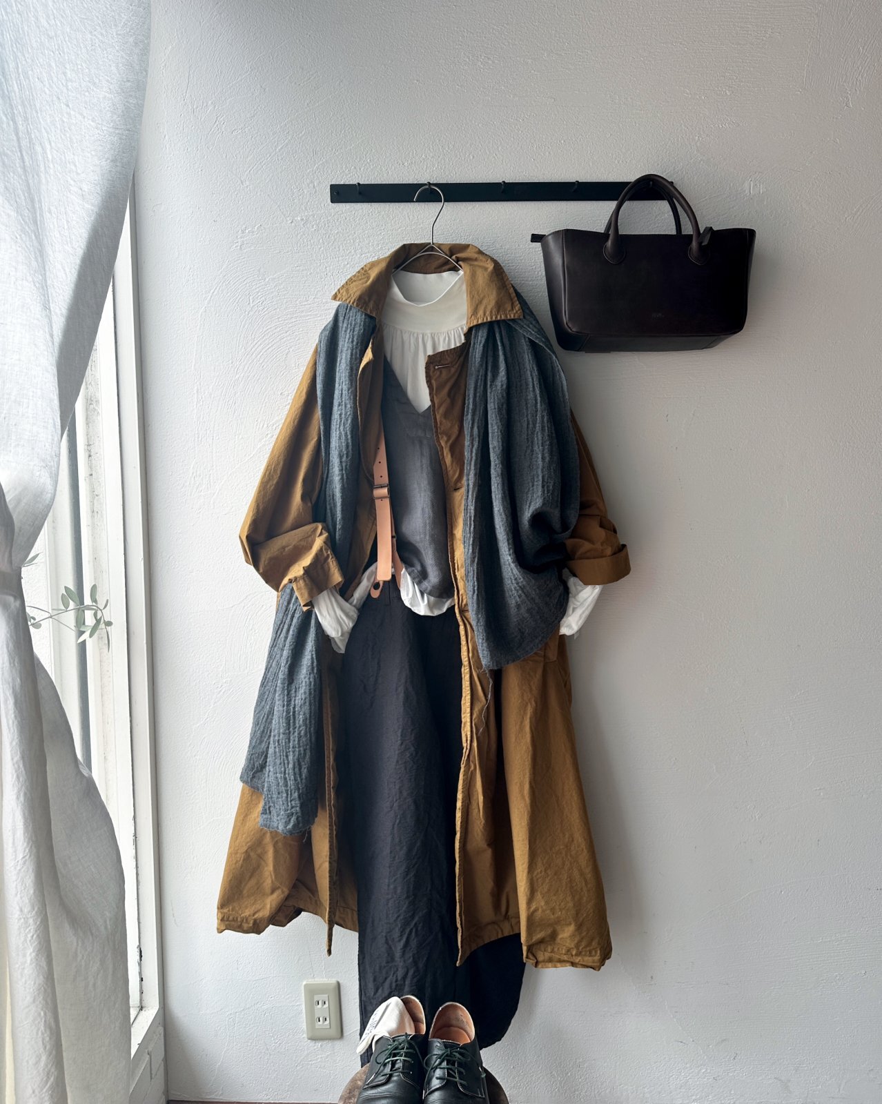 ボリュームのあるブラウスやワンピースの上からも重ねられます。