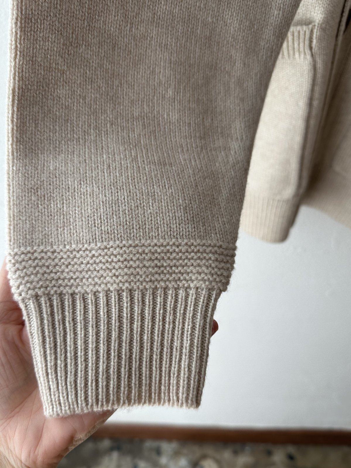 大きめのポケットと袖口やアーム下の編地部分がポイントです