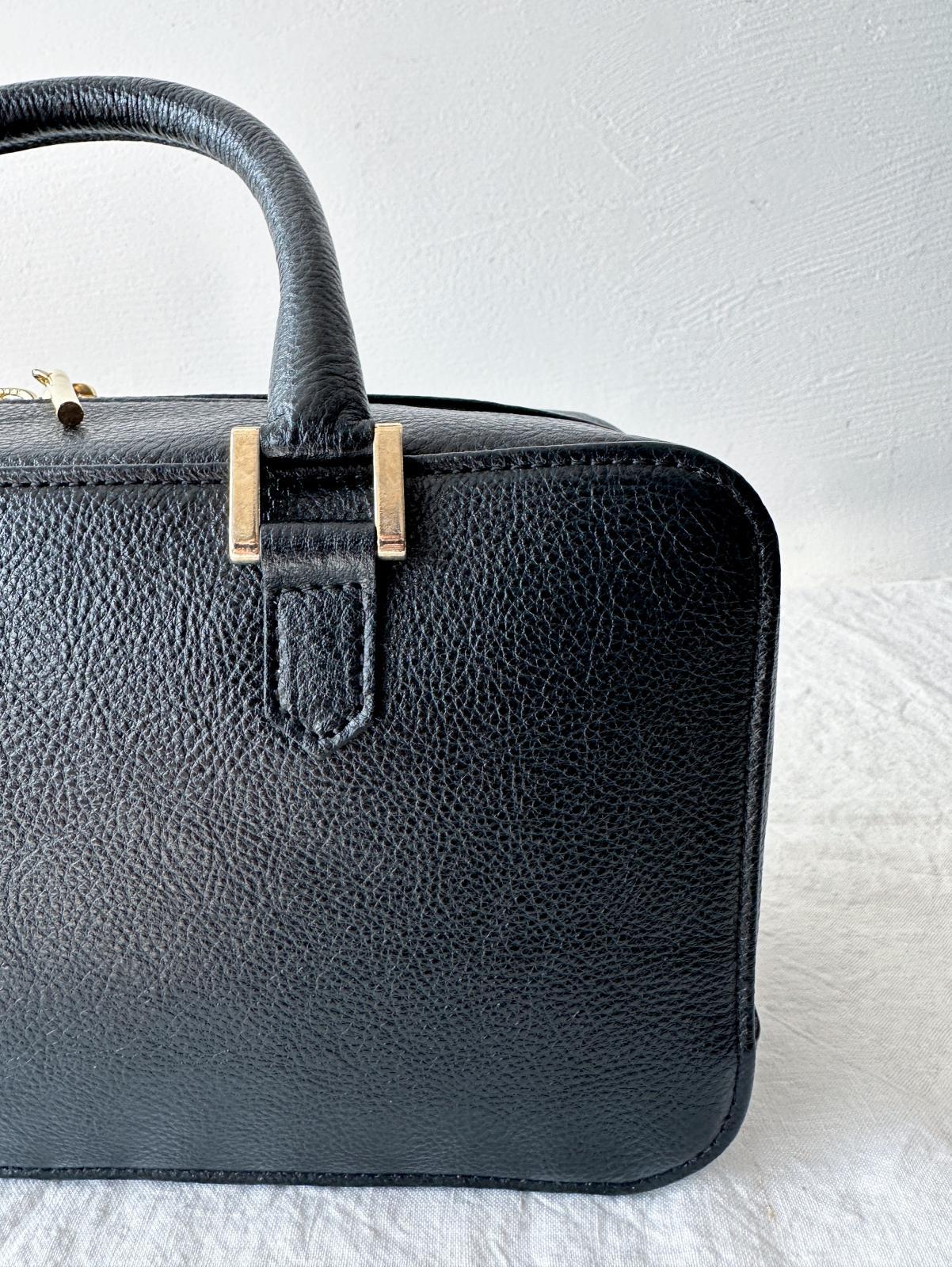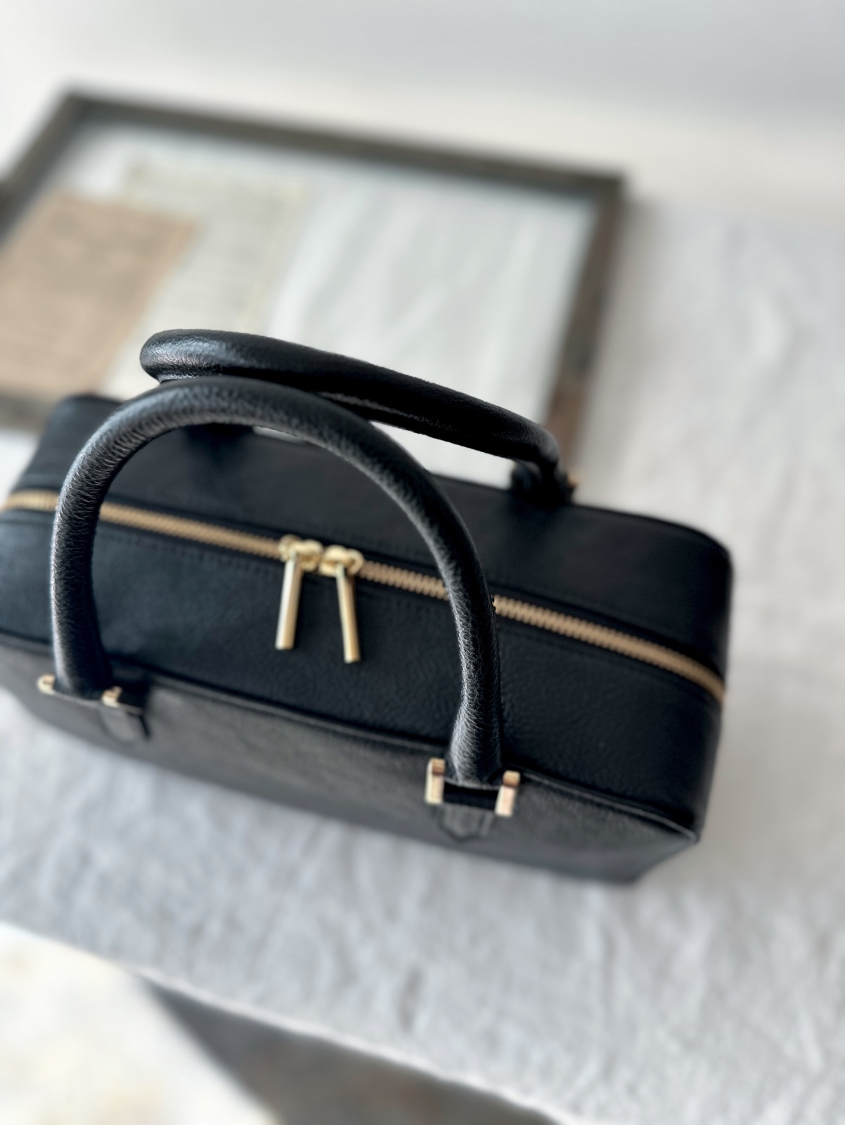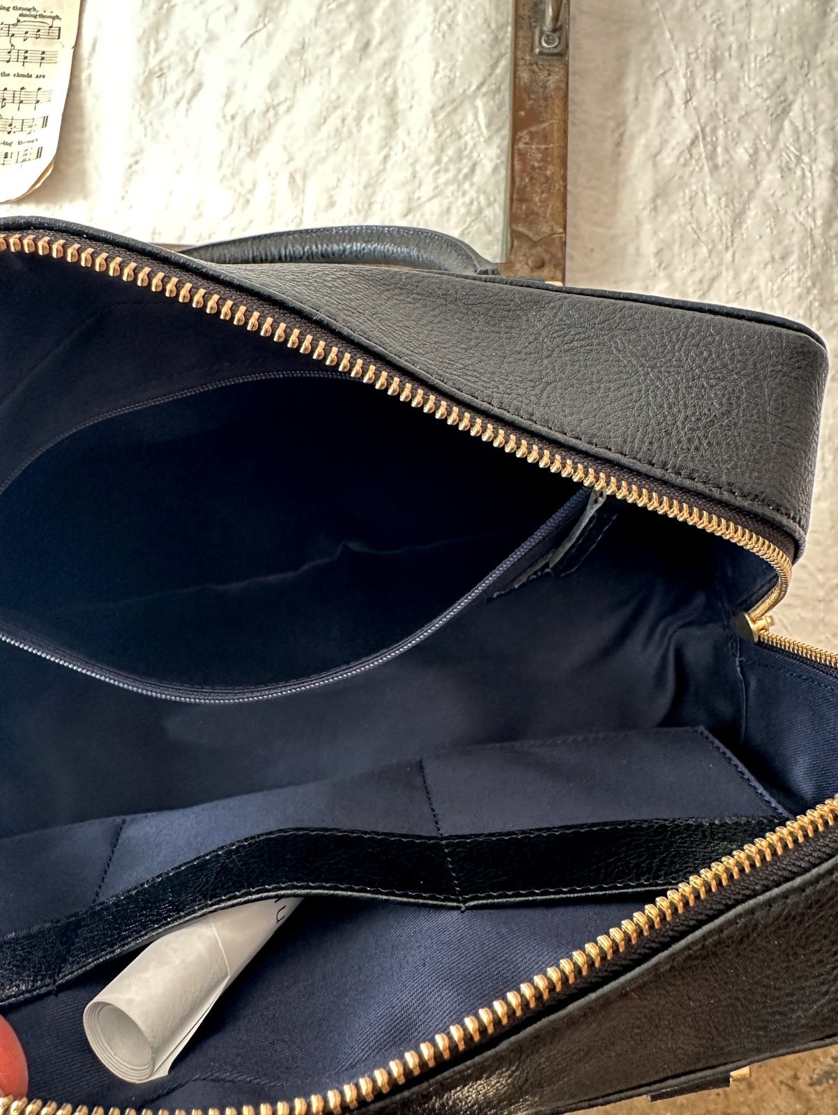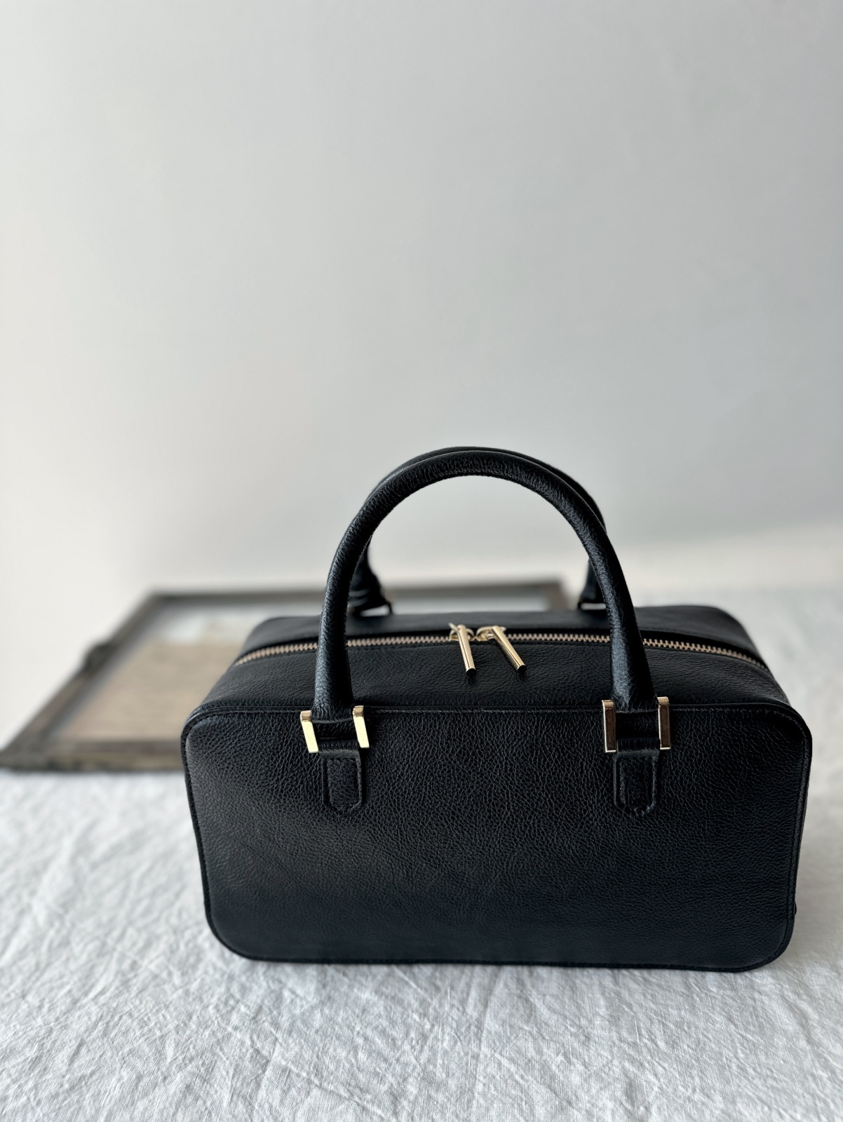 長財布が収まるジップポケットに加え、散らかりがちな鍵やリップ、カードケースなどを仕分けできる3連のポケットが便利なハンドバッグです。