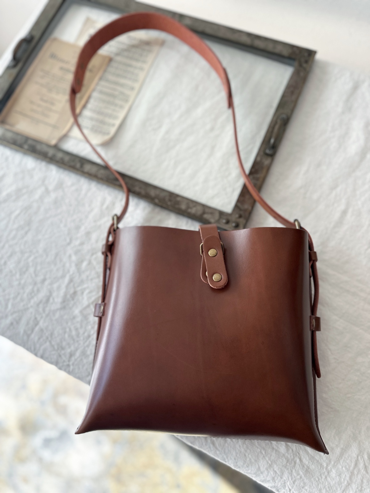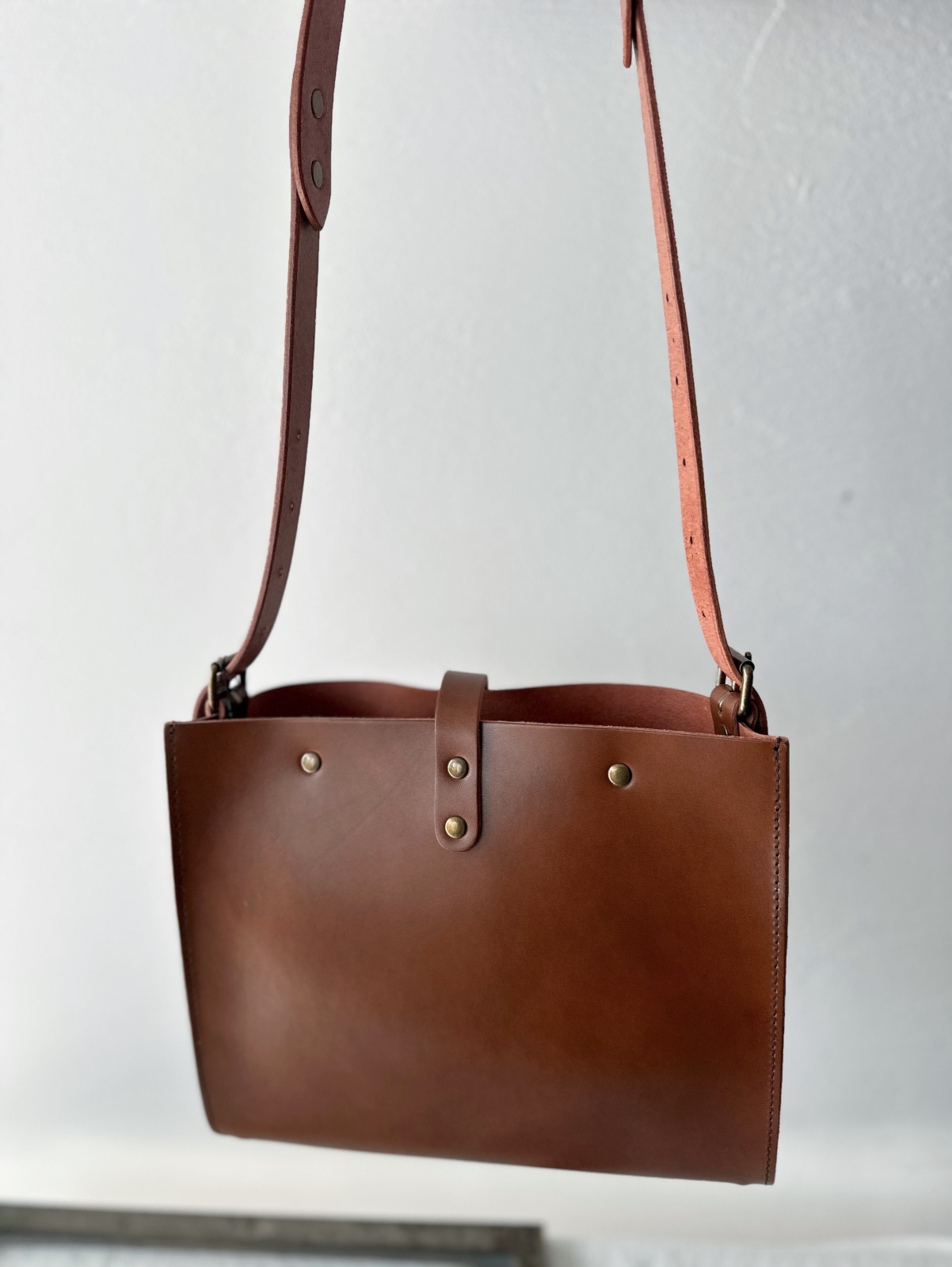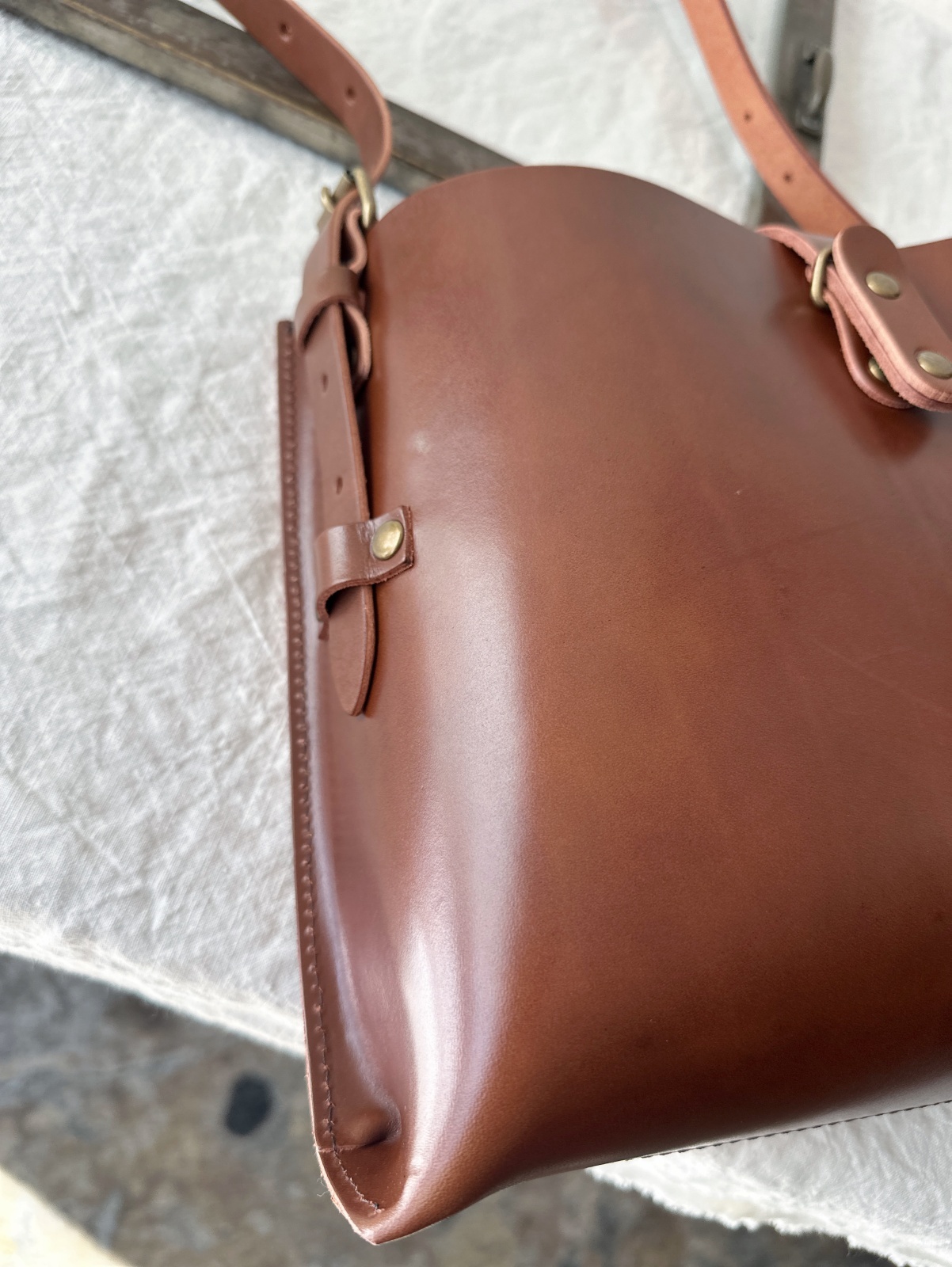 シンプルなデザインで、男女問わずお使い頂けます。厚口のしっかりしたヌメ革に真鍮色の金具、クラシックなデザインと、無骨な印象になりがちですが、そうは見せないのは、マチから前胴にかかる部分のなめらかなカーブの仕様。