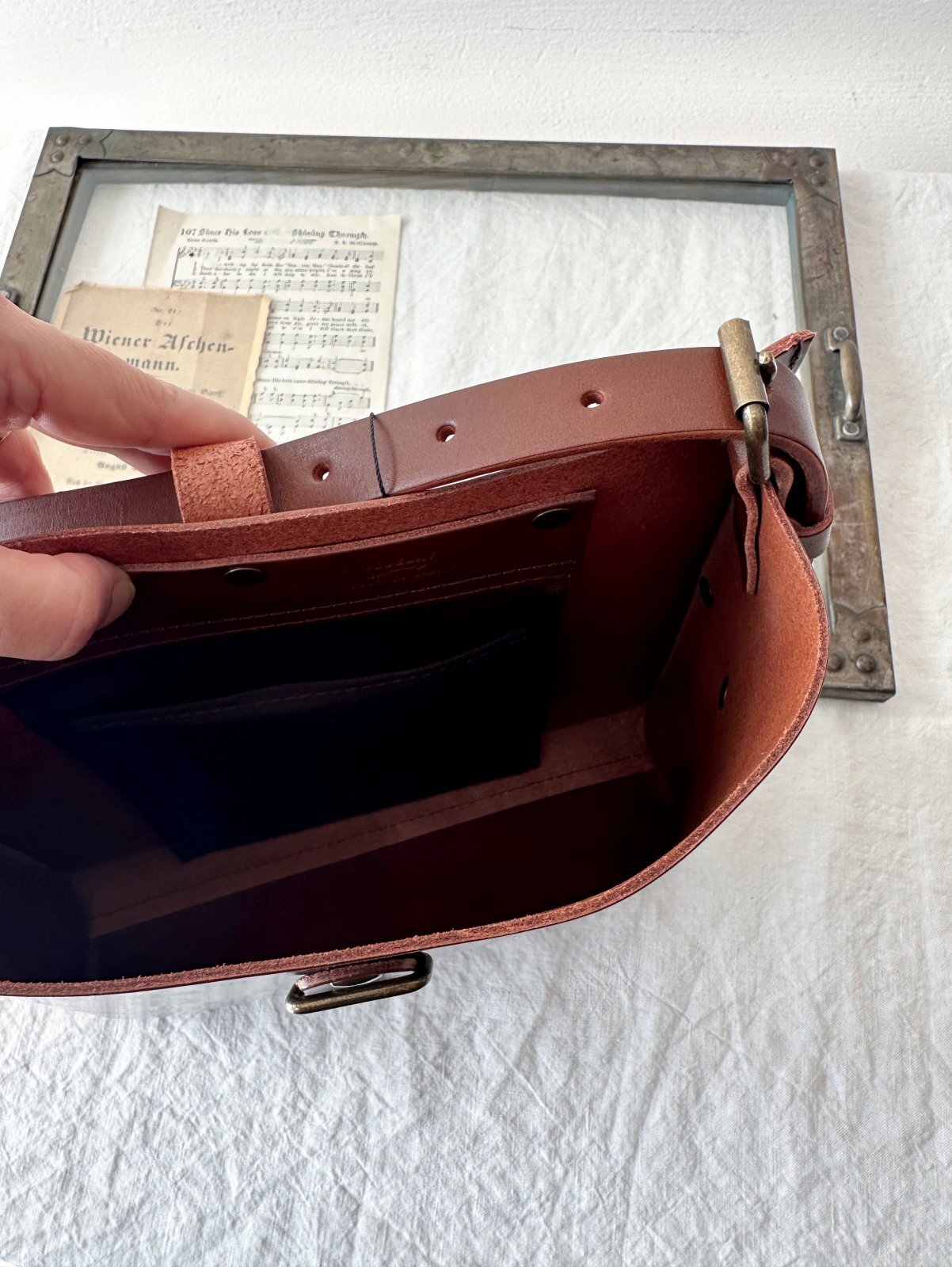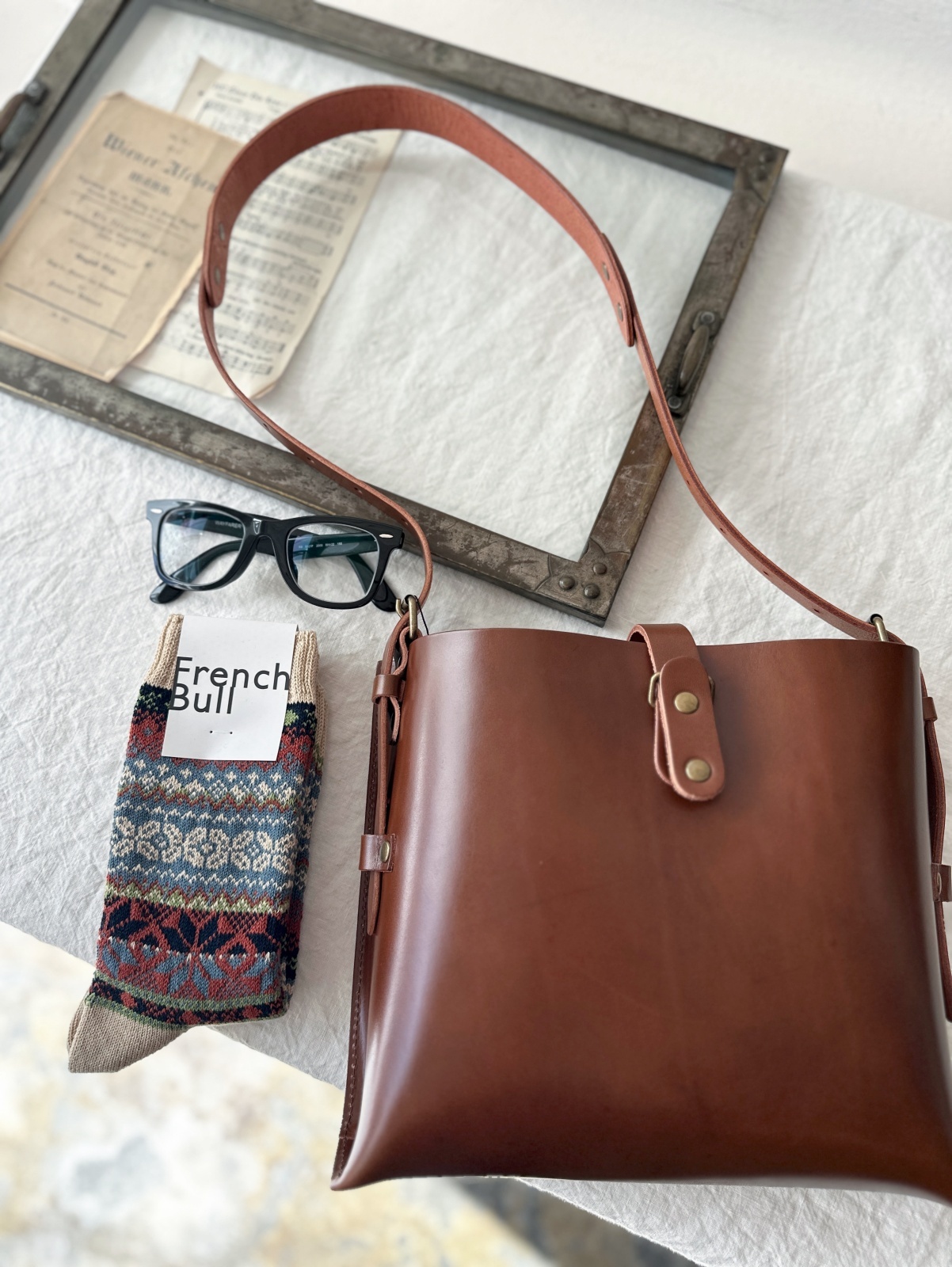 どこか外国の郵便配達員を思わせるヌメ革のショルダーバッグ。