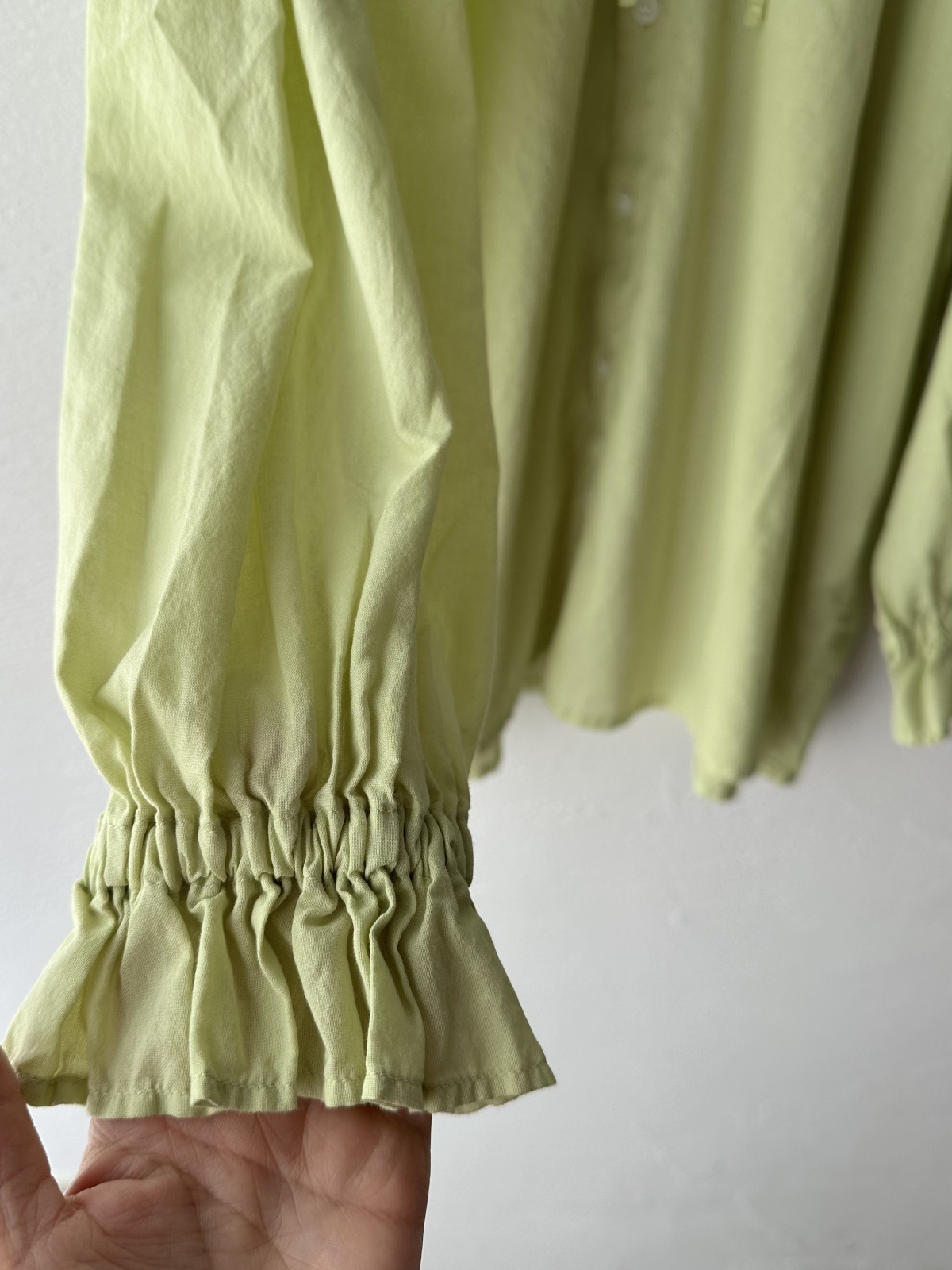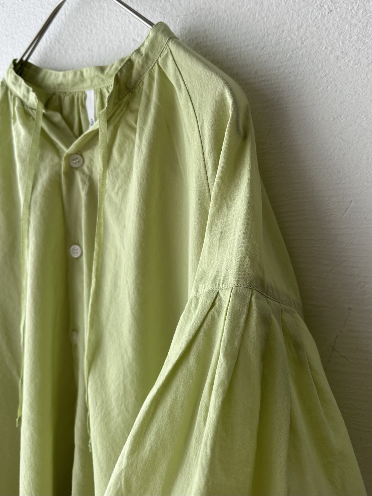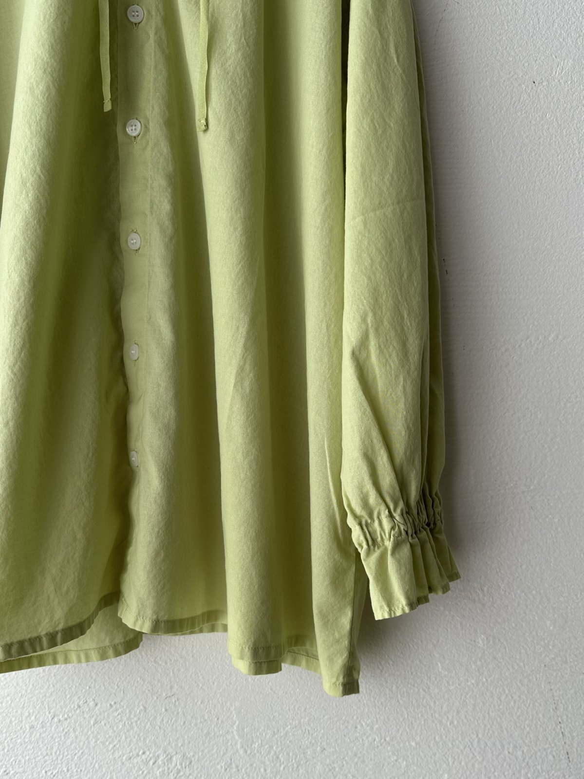 襟元に紐がついており 袖口はギャザーが施してあり可愛らしい印象です