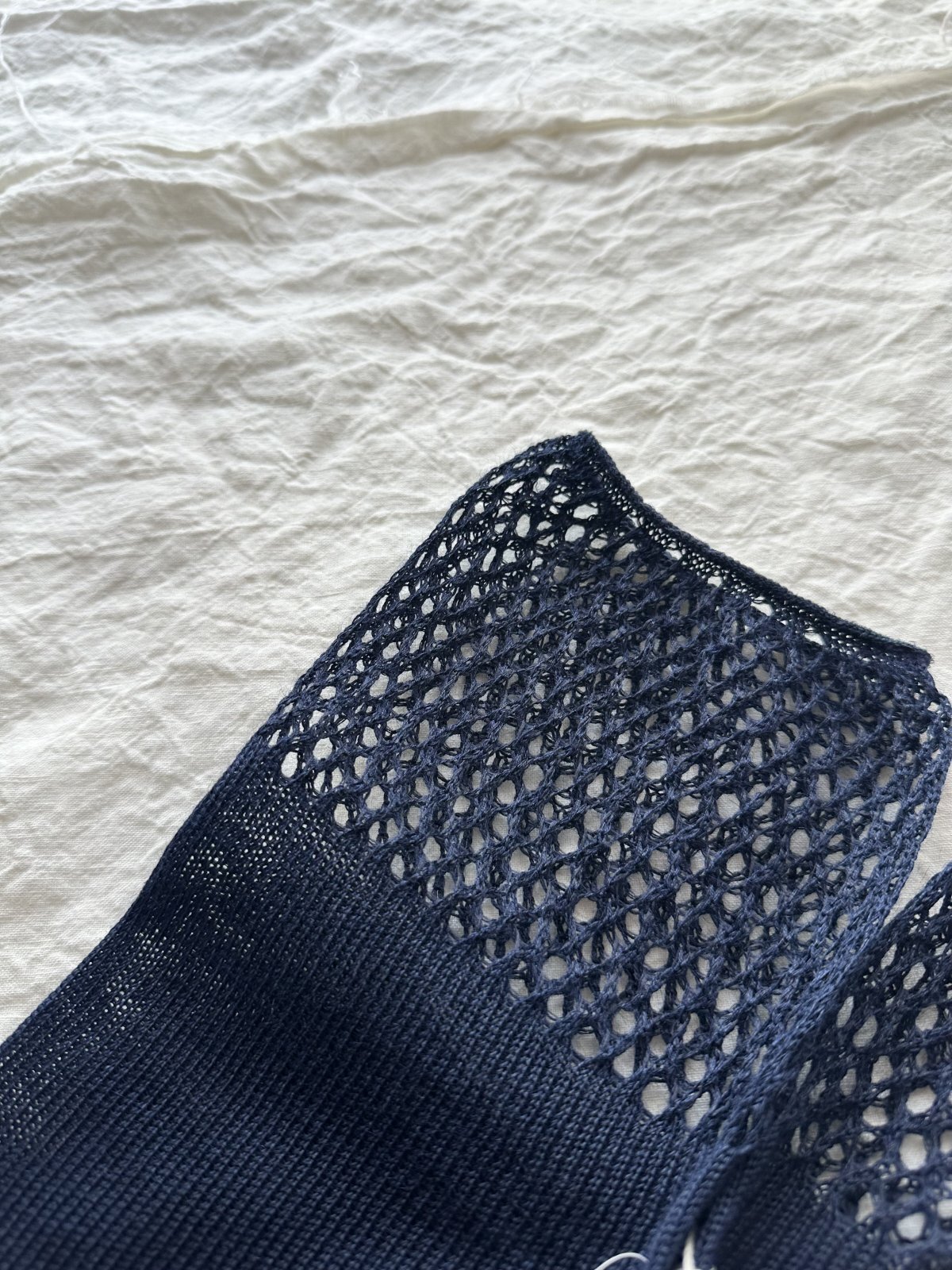 レース編みのような編柄を施したアームカバー