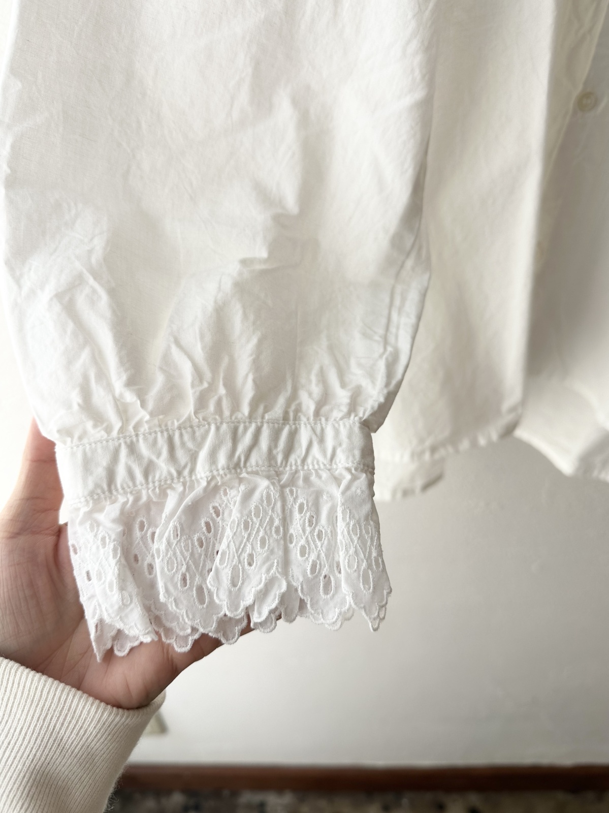 胸元のピンタックと袖口のレースが豪華なシャツ。
