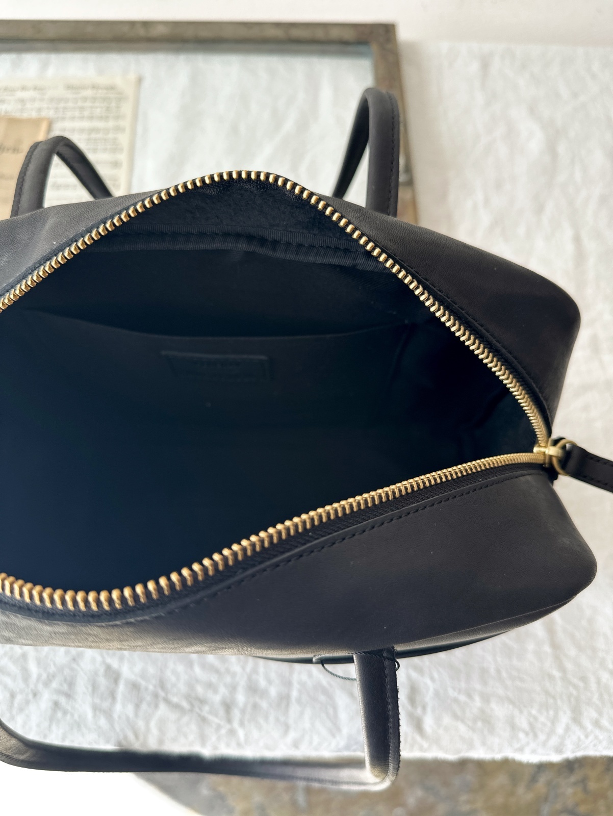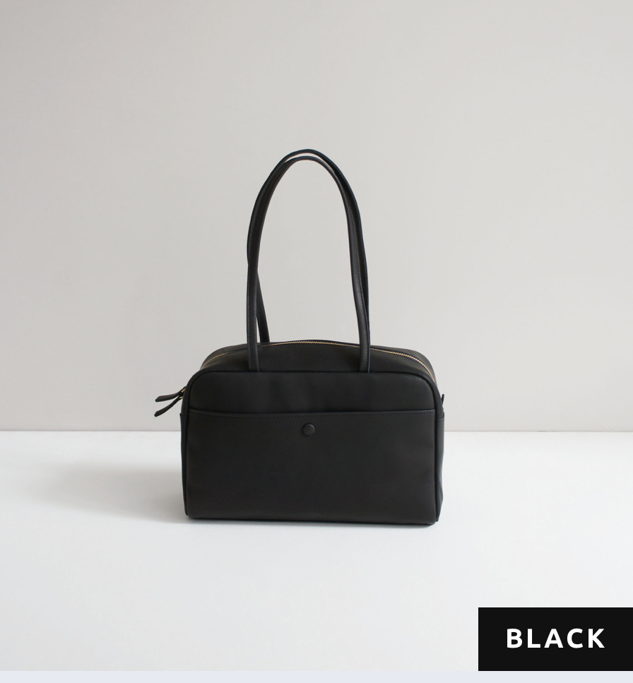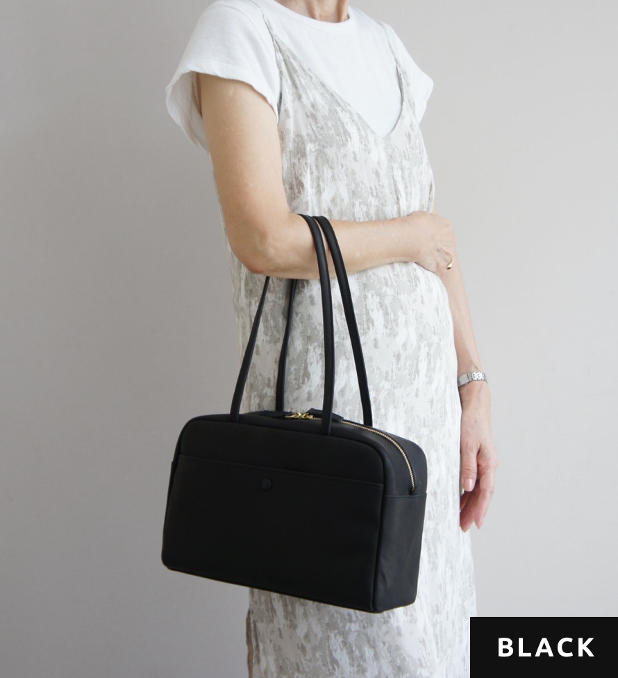 肩回りをすっきりと見せる細身のハンドルに、本体と同革で包んだくるみボタン。