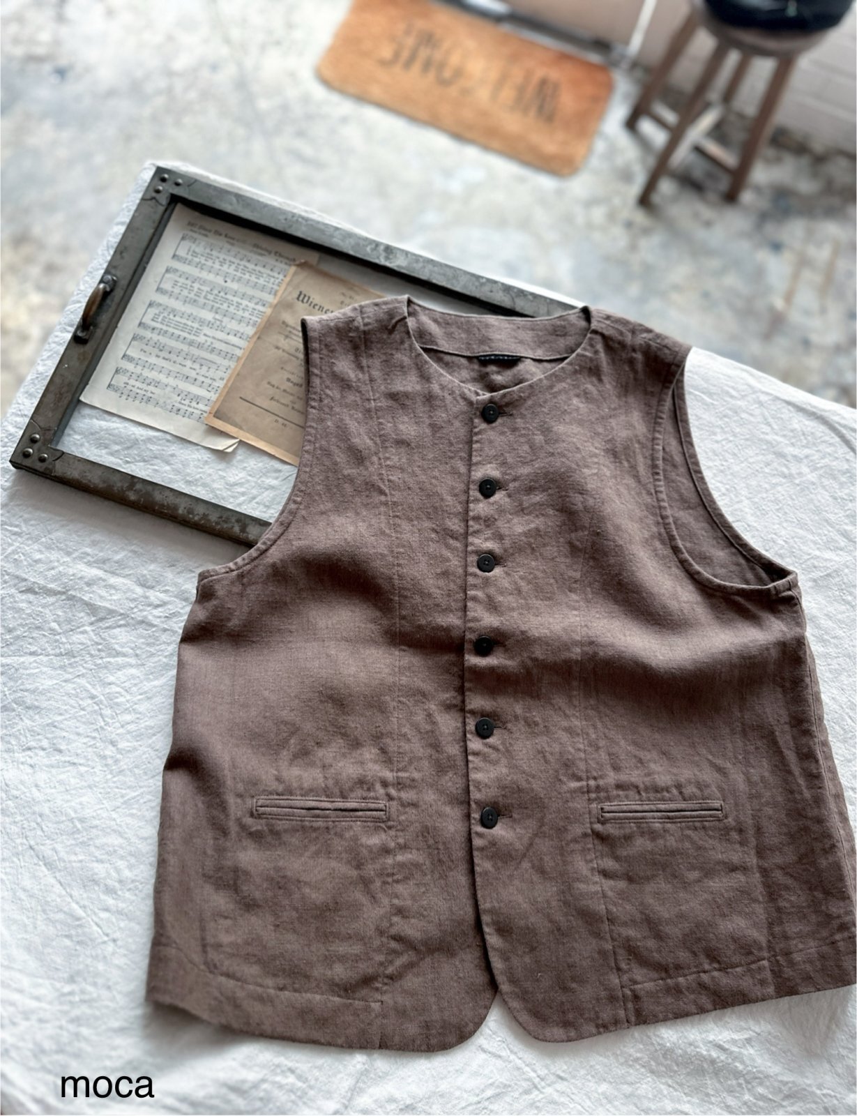 起毛リネンのクルーネックベスト。