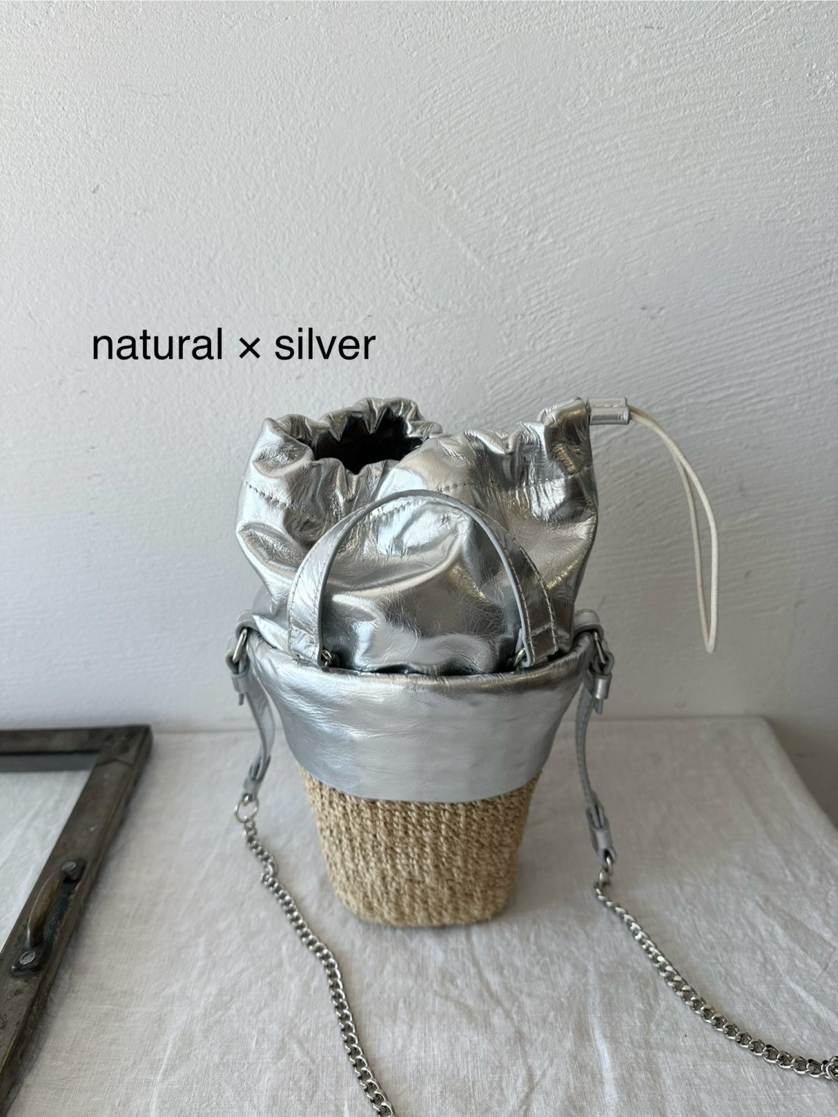 カウレザーとミックスしたモード感のあるバケツ型ミニショルダーバッグ